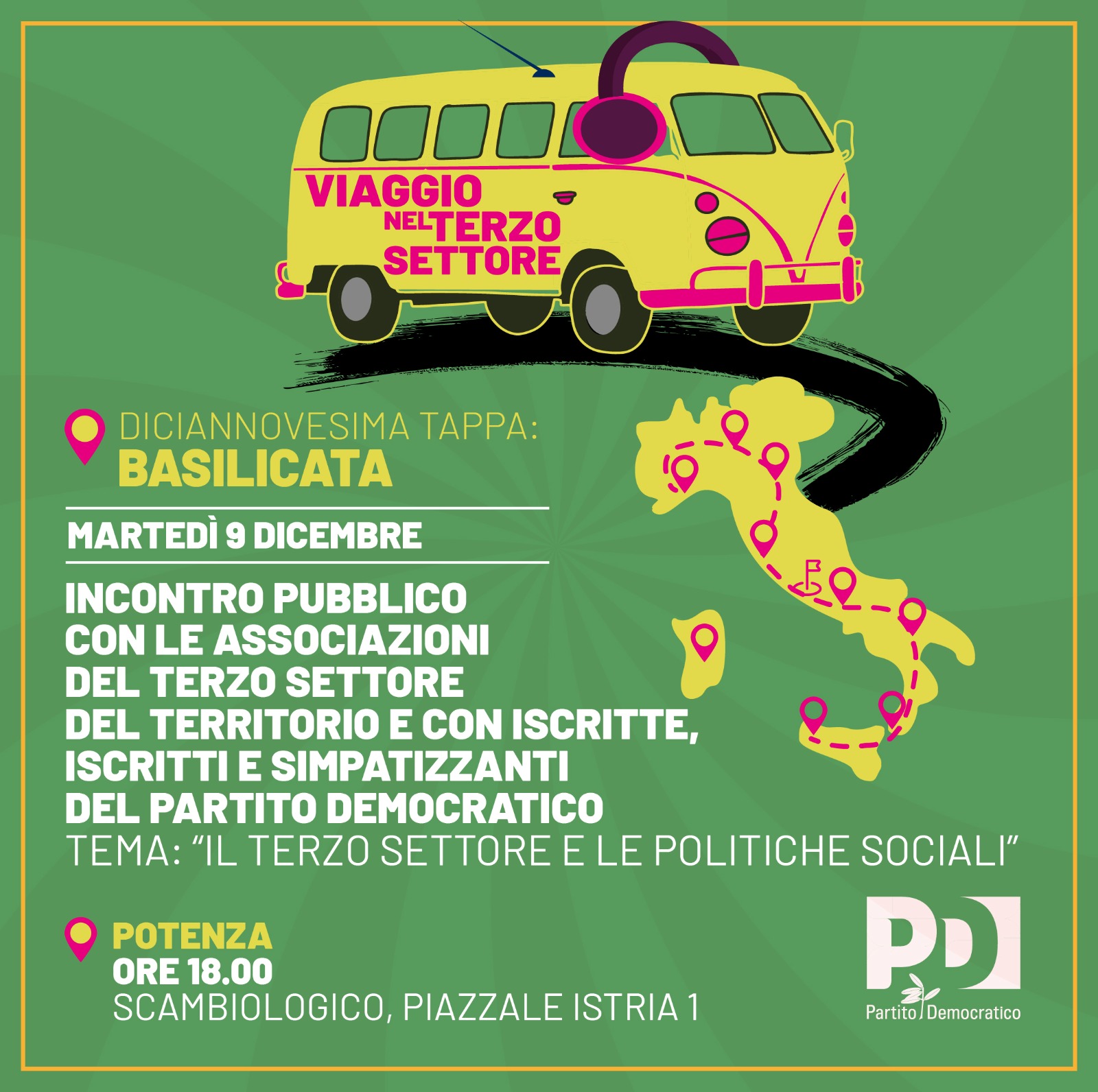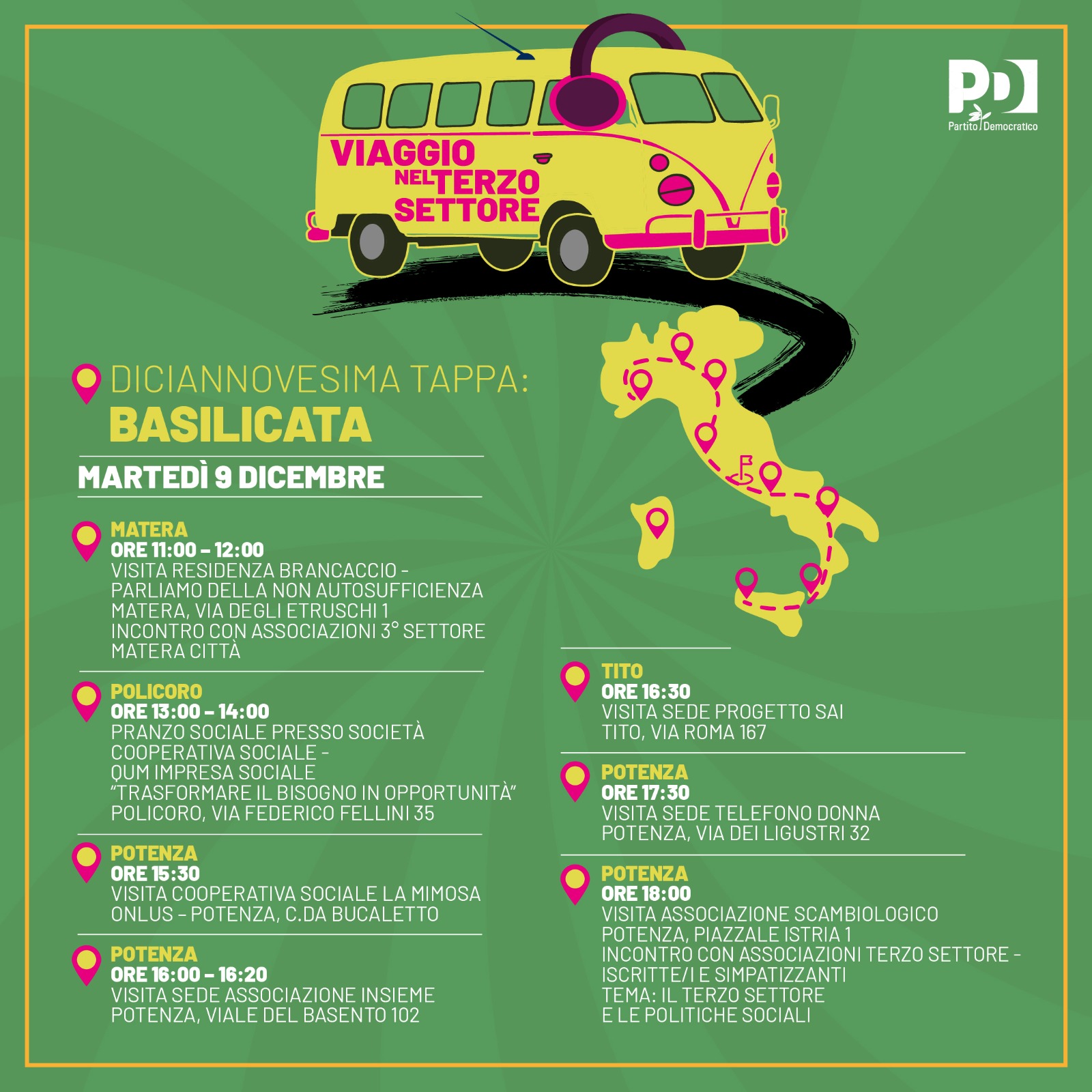La giornata si chiuderà alle ore 18:00 a Potenza con la visita all’associazione “Scambiologico” e con un confronto pubblico con associazioni, iscritte, iscritti e simpatizzanti del terzo settore. Aggiunge l’organizzazione che questo momento conclusivo sarà dedicato al ruolo del terzo settore e alle politiche sociali necessarie a sostenerlo, in un contesto regionale che richiede visione, responsabilità e dialogo strutturato con chi opera ogni giorno nei servizi.